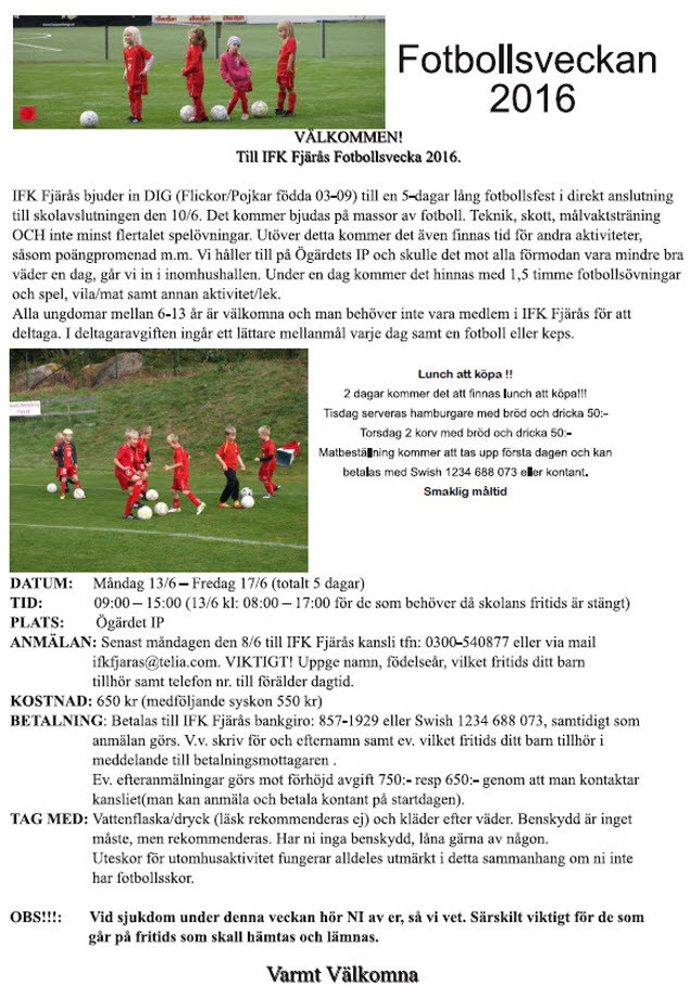 Hej! IFK Fjärås kommer även i år att anordna Fotbollsveckan. Det brukar vara mycket uppskattat av barnen. Hoppas det är många från F-08 som skall vara med! Mer info här Fotbollsveckan /Ledarna