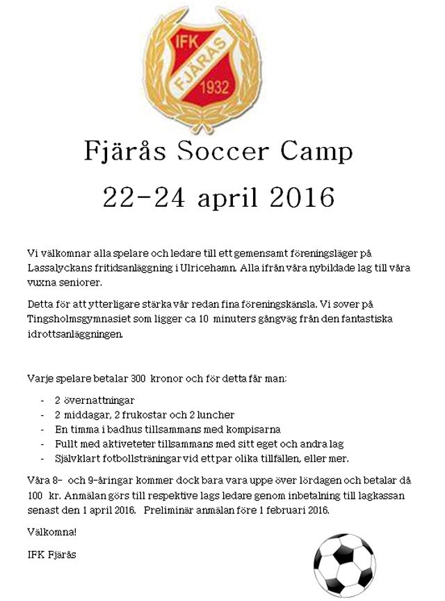 Hej! IFK Fjärås bjuder in till ett föreningsläger i Ulrichehamn lördagen den 23:e april 2016 så boka in detta datum redan nu i kalendern. Vi hoppas alla kommer kunna följa med på detta. För F-08 så gäller preliminärt samling i Ulricehamn på Lassalyckans fritidsanläggning ca kl 10. Där ska vi träna, äta lunch, bada i simhallen och vara med på andra roliga aktiviteterför för att sedan åka hem efter middagen kl 18.30. Anmälan önskas vi få in snarast möjligt, skriv gärna i kommentarsfältet nedan eller maila filip.goude@gmail.com Mera info och detaljer om lägret kommer framöver. Mvh Ledarna Damjunior 15 feb 2016 6kommentarer